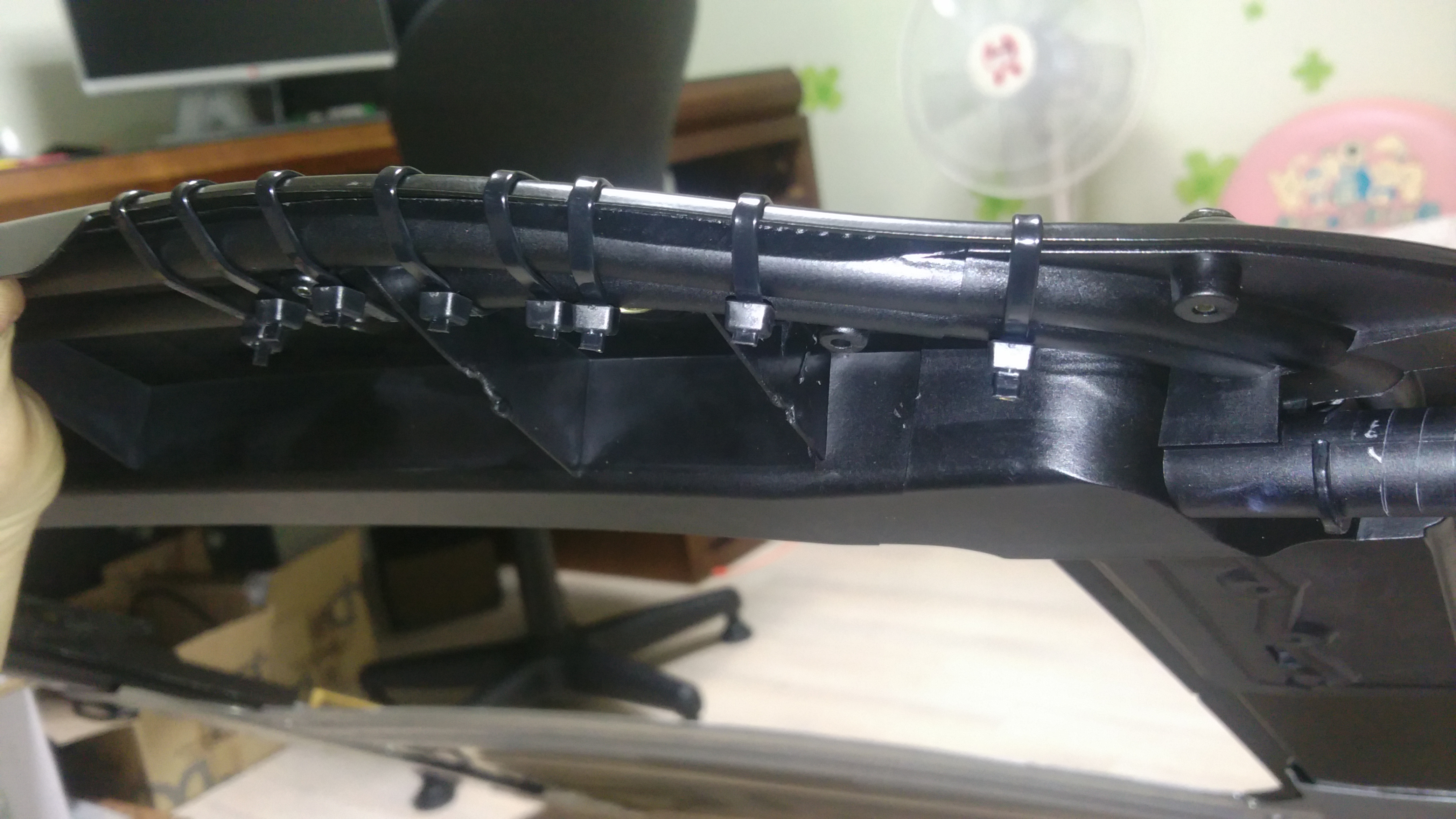다시 조립하고 더이상 케이블이 틈사이로 튀어나오지 못하게 케이블 타이로 꽁꽁 묵엇습니다.
